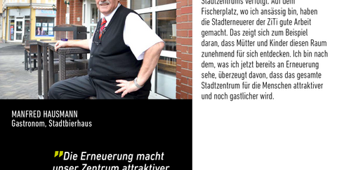 Ich bin seit 1980 Gastronom in Troisdorf und habe die Entwicklung des Troisdorfer Stadtzentrums verfolgt. Auf dem Fischerplatz, wo ich ansässig bin, haben die Stadterneuerer der ZiTi gute Arbeit gemacht. Das zeigt sich zum Beispiel daran, dass Mütter und Kinder diesen Raum zunehmend für sich entdecken. Ich bin nach dem, was ich jetzt bereits an Erneuerung sehe, überzeugt davon, dass das gesamte Stadtzentrum für die Menschen attraktiver und noch gastlicher wird.