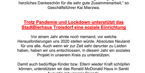 11.12.2020: StadtBierhaus Troisdorf unterstützt soziale Einrichtung