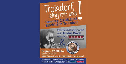 Eine neue Veranstaltung findet am 10.06.18 erstmals in der Stadthalle Troisdorf statt. Hendrik Brock, der Frontsänger der kölschen Band „Boore“, gelang es bereits bei anderen Veranstaltungen, wie z.B. „Rheed singt“, „Heimat Shoppen 2017“ und „Linde singt“, ein Mitsingkonzert mit einem begeisterten Publikum auf die Beine zu stellen.