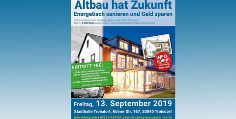 Am 13. September laden die Energieagentur Rhein-Sieg und das Klimaschutzmanagement der Stadt Troisdorf zum großen Info-Abend rund um energetische Sanierung ein