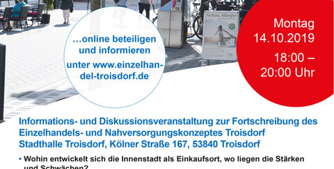 Informationen zum Prozess der Fortschreibung des Einzelhandels- und Nahversorgungskonzeptes stehen online auf der städtischen Homepage www.troisdorf.de in der Rubrik Wirtschaft_Bauen/Stadtplanung/Stadtentwicklung/Einzelhandel zur Verfügung. Ab dem 15.10.2019 kann das interaktive Portal des von der Stadtverwaltung beauftragten Fachbüros unter www.einzelhandelskonzept-troisdorf.de genutzt werden. Mit Anregungen kann man sich dort bis zum 30.11.2019 am Prozess beteiligen.