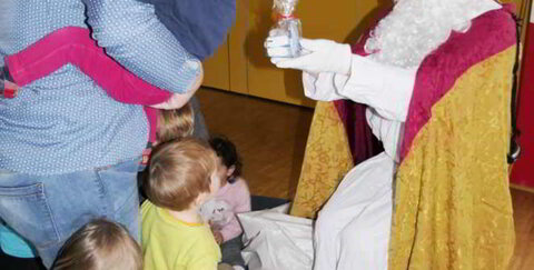 Gerade noch sangen 10 Troisdorfer Tagesmütter zusammen mit 30 kleinen Kindern im Stadtteilhaus Friedrich-Wilhelms-Hütte ein Nikolaus-Lied, da stiefelte auch schon der heilige Mann herein und rief „Ho ho hooo“ mit sonorer Stimme. Es war für alle eine gelungene Überraschung: Im beeindruckenden Bischofskostüm und mit langem Bart nahm der Nikolaus in der großen Runde Platz und sprach mit den Kindern, die mit großen Augen und plötzlich ganz ruhig vor ihm saßen.