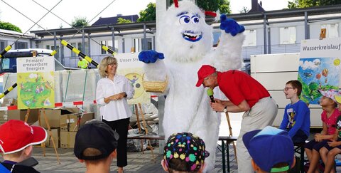 „Wir haben heute ganz viele verschiedene Sachen zusammen gespielt und das hat richtig Spaß gemacht. Am tollsten fand ich das Verstecken und das Spiel mit dem Werfen“, so der 6-jährige Henry. Wie er waren die meisten Kinder zu Beginn noch etwas schüchtern und zur Neugierde gesellte sich ein wenig Skepsis, was wohl eine Reise in die Energiewelt ist. Doch schon nach wenigen Minuten waren alle Kinder begeistert bei der Sache und konnten es kaum erwarten, selbst mit einem symbolischen Wassermolekül durch eine Röhre zu krabbeln und diesen von der Quelle bis zur Badewanne zu transportieren. Geschicklichkeit und Tempo waren bei diesem Parcours gefragt, der anschaulich den Wasserkreislauf darstellte. Treffsicherheit zahlte sich beim Wurfspiel unter dem riesigen Solar-Carport aus, wo die Kinder auf einem großen Plan beispielsweise auf eine Windmühle, einen Staudamm oder Solarfelder – alles Energiequellen der Erde – zielen mussten, um möglichst viele Punkte zu bekommen.