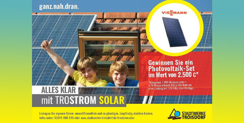 Der regionale Energieversorger macht damit auf sein nachhaltiges Produkt „TroStrom Solar“ aufmerksam. „Mit „TroStrom Solar“ haben die Kunden keine Investitionskosten und können ihren Strom trotzdem auf dem eigenen Dach produzieren. Hausbesitzer können so ihre Stromkosten senken und gleichzeitig CO2-Emissionen reduzieren“, sagt Sebastiano Ferro, Kundenberater der Stadtwerke Troisdorf. „Gerne erläutern wir den Messebesuchern wie „TroStrom Solar“ funktioniert. Sollte die Dachfläche geeignet sein, lässt sich sogar berechnen, wie hoch die Einsparungen sind. Wenn die Sonne mehr Energie spendet als die Hausbewohner verbrauchen, wird der Strom gegen eine Vergütung ins Netz eingespeist und versorgt so andere Kunden der Region.“