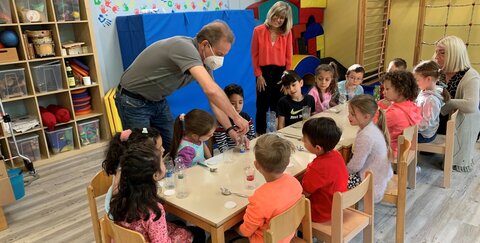 Umweltpädagoge Carsten Schultz von der Deutschen Umwelt Aktion (DUA) begeistert ein ums andere Mal die Vorschulkinder mit seinen spannenden Experimenten, kreativen Mitmach-Aktionen und kindgerechten Erläuterungen. Dabei geht er Fragen auf den Grund, woher beispielsweise das Wasser kommt und welche Eigenschaften es hat. Statt mahnend mit erhobenem Zeigefinger zu erklären, dass beispielsweise beim Zähneputzen der Wasserhahn zugedreht werden soll, lernen die Kinder im Workshop auf spielerische Art und Weise, wie jeder einzelne seinen Beitrag dazu leisten kann, Trinkwasser angemessen und nachhaltig zu nutzen sowie zu schützen.