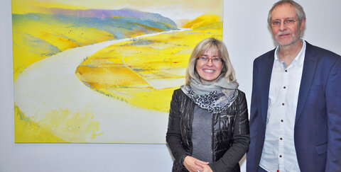 Es sind die Gegensätze, die Holger Figges Aquarelle so spannend machen, dass man jedes einzelne Bild so lange betrachten will. „Figge hat sich tagsüber mit dem Bau von Straßen beschäftigt und abends in seinem Atelier das Element Wasser als Mitgestalter seiner Bilder verwendet. Aus diesen beiden Gegensätzen entstehen Bilder mit faszinierenden Spannungsbögen“, lobte Stadtwerke-Geschäftsführerin Andrea Vogt bei der Eröffnung der Ausstellung „WasserWerke“ des Bonner Künstlers Holger Figge. Dabei sei das Wort WasserWerke durchaus doppeldeutig zu verstehen. Denn Figges Welt ist von Bauen und Wasser geprägt. Beruflich war er zuletzt als Ingenieur für Straßenbau im Bundesverkehrsministerium in Bonn tätig, privat ist das Malen von Aquarellen seit über 30 Jahren seine Leidenschaft. „WasserWerke ist eine wunderbare Werkschau“, so Vogt. Sie zeige viele Beispiele dafür, wie Figge mit seiner speziellen Maltechnik zum einen große, farbige Flächen schafft, die er dann durch Linien und Formen strukturiert, etwa von Bäumen, Häusern und Landschaftsstrukturen.