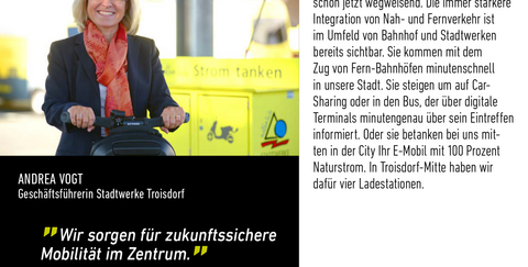 Die Zukunft wird neue vernetzte Formen der Mobilität erleben. Troisdorfs Zentrum ist hier schon jetzt wegweisend. Die immer stärkere Integration von Nah- und Fernverkehr ist im Umfeld von Bahnhof und Stadtwerken bereits sichtbar. Sie kommen mit dem Zug von Fern-Bahnhöfen minutenschnell in unsere Stadt. Sie steigen um auf Car-Sharing oder in den Bus, der über digitale Terminals minutengenau über sein Eintreffen informiert. Oder sie betanken bei uns mitten in der City Ihr E-Mobil mit 100 Prozent Naturstrom. In Troisdorf-Mitte haben wir dafür vier Ladestationen.