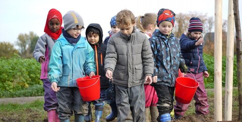 Fleißig haben die Kinder der Kita Flachtenstraße geholfen, die Wildsamen rund um die zehn Obstbäume auszusäen.