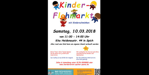 Am 10.03.2018 in der Zeit von 11:00-14:00 Uhr veranstaltet der Förderverein der Spicher Pänz Kita Heidenaustraße wieder seinen Kinderflohmarkt in der Kita Heidenaustr. Hier findet Ihr alles rund ums Kind. Gerne könnt Ihr auch selbst gut erhaltene Kleidung oder Spielsachen am eigenen Stand verkaufen oder sogar dem Förderverein (voretikettiert) in Kommission geben und die Mitarbeiter der Kita verkaufen die Kleidung oder Spielsachen dann für Euch. Auch ist für Ihr leibliches Wohl gesorgt.