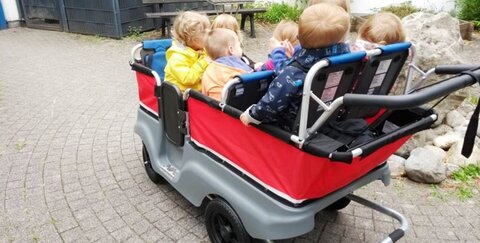Voller Vorfreude setzten sich 6 Kinder in den Wagen und los ging es einmal quer durch Bergheim. Natürlich durfte jedes Kind mal mitfahren. Das war ein Erlebnis! Der Turtlewagen erleichtert größere Ausflüge auch mit unseren Kleinsten ganz enorm und wir können es nicht erwarten, nun regelmäßig on Tour zu sein. Unser besonderer Dank gilt unserem tollen Förderverein, ohne den eine solche Anschaffung nicht möglich gewesen wäre“.