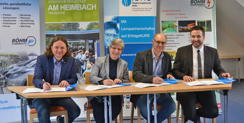 Bereits am Folgetag wurde die KURS-Lernpartnerschaft zwischen der Firma Böhm Elektrobau und der Realschule Am Heimbach ratifiziert. Firmenchef Martin Böhm, selbst ehemaliger Schüler der Realschule, betonte dabei, dass ihm die Zusammenarbeit sehr am Herzen liege. Seit vielen Jahren mache er sehr positive Erfahrungen mit Bewerbern der Schule und freue sich nun auf einen noch intensiveren Austausch. Geplant sind gemeinsame Unterrichtseinheiten, Praktika und Berufsfelderkundungen. Darüber hinaus organisert das Unternehmen für die Schüler der Physik- und Technikkurse den Besuch der Elektrotechnik-Fachmesse in Dortmund.