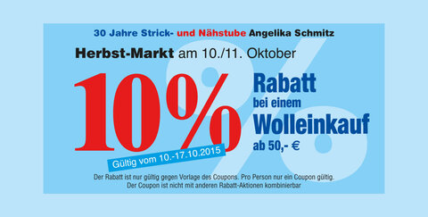Die Nähstube Schmitz bietet euch zum Herbstmarkt am 10.+11. Oktober 2015 10% Rabatt auch einen Woll-Einkauf ab 50 Euro.