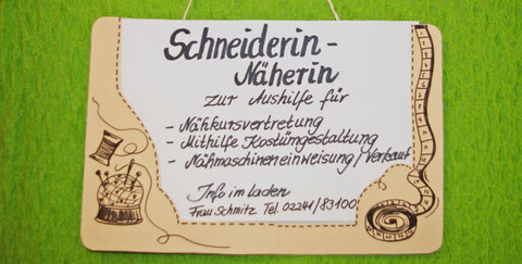 Die Strick- und Nähstube sucht eine Schneiderin / Näherin zur Aushilfe für Nähkursvertretungen, Mithilfe bei der Kostümgestaltung, zur Nähmaschineneinweisung und im Verkauf. Bei Interesse gerne persönlich oder telephonisch bei Frau Schmitz melden: Tel. 02241 / 83100.