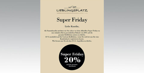 Als Stammkundin möchte das Team euch schon vor dem offiziellen Super Friday einladen, euren persönlichen Rabatt von 20% auf die gesamte Kollektion zu nutzen. 10% erhaltet ihr zusätzlich auf die CARTOON Kollektion, wenn ihr euch für eine Kundenkarte registrieren lasst.