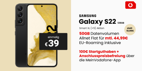 Vodafone Smart XL 50 GB LTE inkl. Samsung S 22, 128 GB für einmalig 39,00 EUR