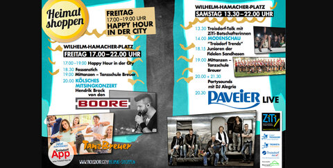 Das zweitätige Event „Heimat shoppen“ startet mit der Happy-Hour am Freitag Nachmittag, in der Ihr sicher das ein oder andere Schnäppchen ergattern könnt. Euch erwartet ein großartiges Abendprogramm mit einem tollen Tanz-Workshop der Tanzschule Breuer sowie ein kölsches Mitsingkonzert mit dem Boore-Frontmann Hendrik Brock und dem Top-Gitarristen Jörg Hamers. Ihr dürft also nicht nur zuschauen und zuhören, sondern auch mittanzen und singen, was das Zeug hält.
