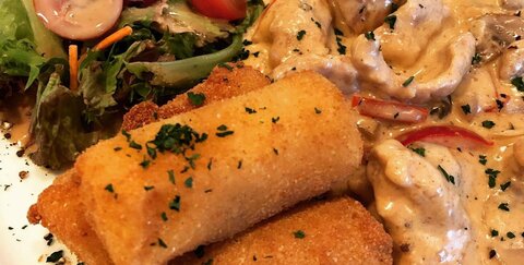 Putengeschnetzeltes Züricher Art mit Champignon und Paprikastreifen an hausgemachten Kroketten und Beilagensalat mit Balsamicodressing