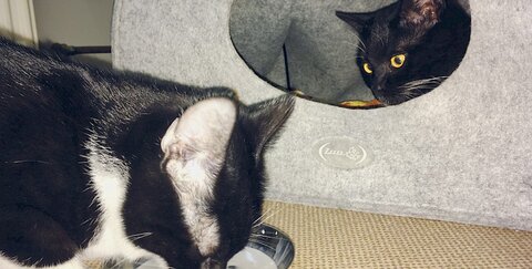 Wegen Teddys Behinderung sollen die Zwei in Wohnungshaltung, gerne mit einem gesicherten Balkon. Mit einer intelligenten Katzenklappe wäre für Flip auch Freigang möglich.