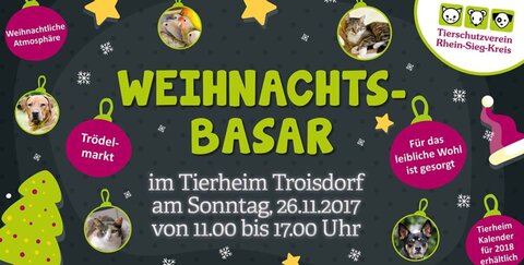 Das Tierheim Troisdorf lädt alle Tierfreunde herzlich ein, in der Vorweihnachtszeit den traditionellen Weihnachtsbasar am 26.11.2017 von 11 bis 17 Uhr zu besuchen
