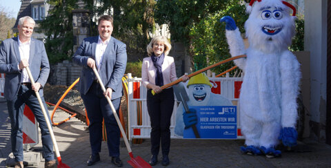 So schnell, dass er sich selbst überholt: Noch früher als geplant buddelt der JETI in Troisdorf-Mitte und bringt den Bürgern turboschnelles Highspeed-Internet und Breitbandanschlüsse. Und Anwohner können sich sogar bis zum 30. Juni 2022 einen kostenlosen Hausanschluss sichern! Den ersten Spatenstich setzten Andrea Vogt und Michael Roelofs, TroiKomm-Geschäftsführung, gemeinsam mit Bürgermeister Alexander Biber.