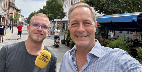 Julius (Radio Bonn Rhein-Sieg) und Dirk (Troisdorf Aktiv e.V.) unterwegs in Troisdorf. Auf der Jagd nach O-Tönen zum Sommerwetter.