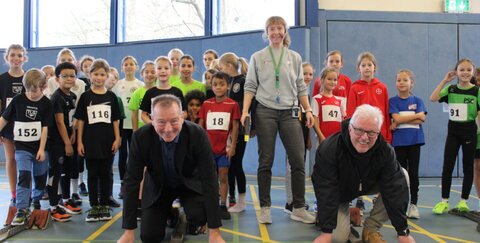 An den Startblöcken: links Holger Steffens (Kreissparkasse Köln (KSK)), rechts Ralf Saborowski (TLG), Trainerin Claudia Obst (TLG) mit Startschuss. Foto: TLG.