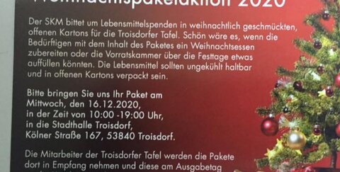 Der SKM bittet um Lebensmittelspenden in weihnachtlich geschmückten, offenen Kartons für die Troisdorfer Tafel.