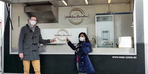 Sumana Sathasivam-Windscheif vor dem Street Food-Trailer mit Wirtschaftsförderer Fabian Wagner