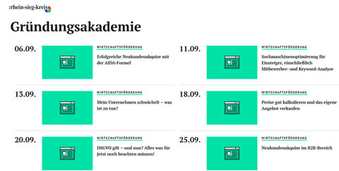 Mit mehr als 30 Veranstaltungen startet im September das bisher umfangreichste zweite Halbjahresprogramm der Gründungsakademie Rhein-Sieg seit ihrem Bestehen. Bereits seit 2006 unterstützt die Akademie - ein gemeinsames Projekt des Rhein-Sieg-Kreises und der Kreissparkasse Köln - Existenzgründer/-innen sowie Unternehmer/-innen mit hilfreichen und überwiegend kostenfreien Seminaren, Workshops und Vorträgen zu relevanten Themen!