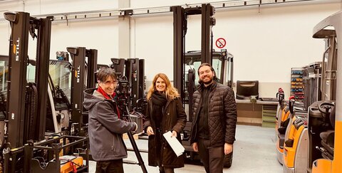 (v.l.n.r.:) Alexander Miller (r.) freut sich über den Besuch der Filmcrew bei Troisdorfer Unternehmen und Projektpartner ZWi Technologies GmbH.