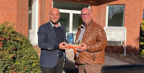 Wirtschaftsförderer Tobias Voits (TROWISTA) begrüßt Geschäftsführer Heinz Röhrig (Troisdorfer Kanalreinigungsservice GmbH) am neunen Standort in der Mottmannstraße.