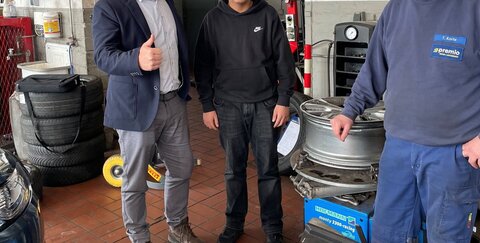 Beim Premio Reifen-Service zeigte Werkstattmeister Thomas Korte Schüler Cihan und Wirtschaftsförderer Tobias Voits das Aufziehen der Reifen auf die verschiedenen Felgen.
