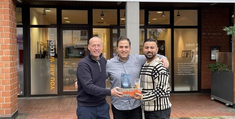 „Die Jungs verfügen über ein top Know-How im IT- und Marketing-Bereich, sind gut vernetzt und beleben die Innenstadt“, freut sich Stephan Frings Zentrenmanager der Troisdorfer Wirtschaftsförderungs- und Stadtmarketing GmbH (TROWISTA) bei der Übergabe des Willkommenspakets an Hamidullah Ghafoorie und Jan Majouno von „IT PRO MEDIA“ vor dem Ladenlokal am Kölner Platz 2 in der Troisdorfer Innenstadt. „Wir sind sehr froh darüber, dass wir dank der Vermittlung durch die TROWISTA und des NRW Sofortprogrammes in Troisdorf starten konnten. Wir wollen mit unserem 360-Grad-Konzept die Troisdorfer Bürger*innen in den Bereichen Marketing, Print-Medien und IT-Service unterstützen“, so Jan Majouno, der bereits seit 2004 kleine und mittelständische Unternehmen in der Rhein-Sieg Region betreut und vor allem im IT-Bereich zu Hause ist, während Ghafoorie vor allem in der Medien- und Online-Beratung unterwegs ist.
