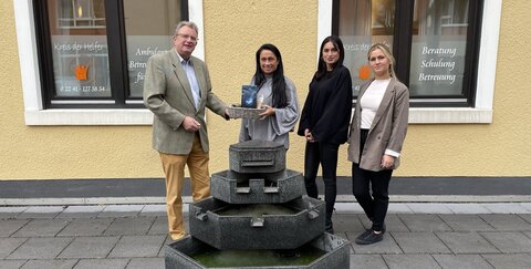 v.l.n.r. Wolf-Dieter Grönwoldt (TROWISTA), Patricia Ableidinger, Romina Ableidinger, Melissa Ableidinger (Kreis der Helfer) bei der Übergabe des Willkommensgeschenkes