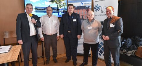 (v.l.n.r.:) Wolf-Dieter Grönwoldt (Geschäftsführung TROWISTA GmbH), Sven Trompetter (Geschäftsführung PGT Thermprozesstechnik GmbH), Bürgermeister Alexander Biber, Günter Grommes(Geschäftsführung PGT Thermprozesstechnik GmbH), Christian Seigerschmidt (Vorstandsvorsitzender pro Troisdorf e. V.)