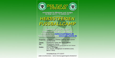 Das Camp kostet euch 89 Euro pro Person (inkl. Snacks, Mittagessen, Getränke, Ball, T-Shirt). Das Anmeldeformular findet ihr unter: www.tus07-oberlar.de. Das Formular ist an: markus-tus07@gmx.de zu senden. Anmeldeschluss ist der 07.10.2017.