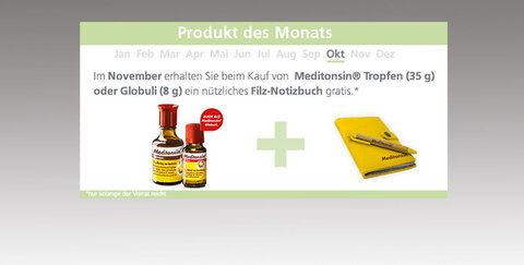 Im November erhalten Sie beim Kauf von Meditonsin Tropfen (35g) oder Globuli (8g) ein nützliches Filz-Notizbuch gratis*.