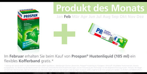 Im Februar erhaltet ihr beim Kauf von Prospan Hustenliquid (105 ml) ein flexibles Kofferband gratis.