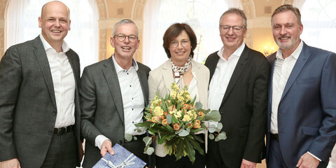 Foto ©VR-Bank Bonn Rhein-Sieg: v. l. Ralf Löbach, Rainer Jenniches, Gisela Bachem, Andre Schmeis und Holger Hürten