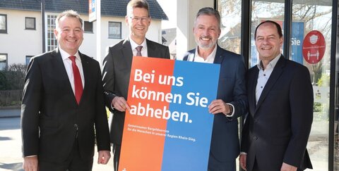 In Troisdorf betreiben die VR-Bank Rhein-Sieg eG und die Kreissparkasse Köln künftig zwei Geldautomatenstellen gemeinsam. Vor Ort trafen sich von der VR-Bank Holger Hürten, Vorstandsvorsitzender, und Christian Seigerschmidt, Direktor Geschäftsstellen, sowie von der Kreissparkasse Ralf Klösges, Regionalvorstand Rhein-Sieg, und Holger Steffens, Regionaldirektor in Troisdorf, um den Beginn der Kooperation in Friedrichs-Wilhelms-Hütte sowie im HIT-Markt zwischen Rotter See und Sieglar offiziell einzuläuten.