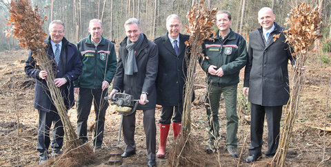 Jörg Fillmann, Fachgebietsleiter, und Gerhard Pohl, zuständiger Revierleiter, vom Landesbetrieb Wald und Holz Nordrhein-Westfalen, Regionalforstamt Rhein-Sieg-Erft, haben die Fläche ausgesucht, die nun mit Buchen, Wildkirschen und Douglasien zwecks Aufforstung bepflanzt werden. Die dort zuvor stehenden Fichten wurden aufgrund der Anfälligkeit für Borkenkäfer durch die heimischen Laubhölzer, aus Wirtschaftlichkeitsgründen gemischt mit Nadelhölzern, ersetzt. An anderer Stelle sorgen 500 kleine Eichen für eine Nachbesserung des Bestandes. Bei den Setzlingen handelt es sich um standortgerechte Baumarten aus den Höhenlagen unserer Region, die auf dem sandigen Boden besonders gut gedeihen.