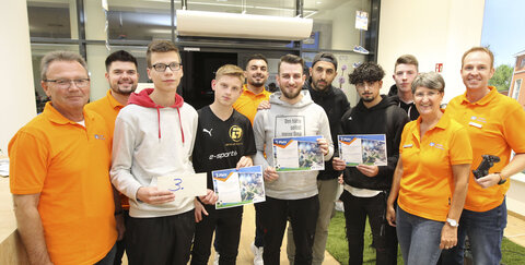BU v. l.: Regionaldirektor Uwe Haupt, Kundenberater Bastian Hausmann, Team Robin Uphues und Joe Hellmann (3. Platz), Azubi Namir Al Jubouri, Team Matthias „Stylo“ Hietsch und Ahmed Cansiz (1. Platz), Team Dildar Celik und Dennis Hammer (2. Platz), Marketingleiterin Andrea Schrahe und Geschäftsstellenleiter Michael Schmitz.