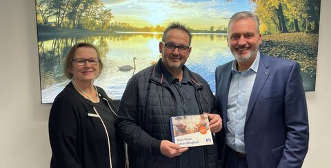 Vorstandsvorsitzender Holger Hürten und Kundenbetreuerin Petra Blöse spielten im Mondorfer Regionalcenter Glückboten und überbrachten dem neuen Mitglied Jürgen Heuser die freudige Nachricht über den Gewinn eines 5-Jahres-Urlaubs-Abos im Gesamtwert von 25.000 Euro.