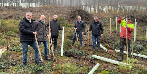 Gemeinsam mit seinem Co-Vorsitzendem Rainer Jenniches und den Vorstandskollegen Ralf Löbach und Andre Schmeis traf Holger Hürten mit Förster Michael Fobbe und Muchs Bürgermeister Norbert Büscher in der Nähe der Mucher Ortschaft Berzbach zusammen, um dieses nachhaltige Projekt zu realisieren.