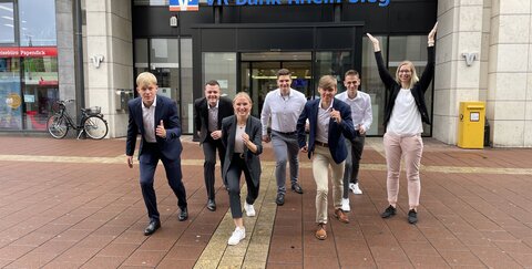 Anschließend ging es für Daniel Helmann, Sarah Impekoven, Justus Kaltenbach, Jan Philip Levermann, Lars Preckel und Fynn Siegburg zu ihrer ersten gemeinsamen Aufgabe, dem Gruppenfoto. Ganz nach dem Motto „Auf die Plätze, fertig, los“ starteten die junge Dame und die fünf Herren auf ihrem gemeinsamen Weg. Dieser wird sie nach dem Einführungstag durch einige Geschäftsstellen und Regionalcenter der Bank führen, aber auch interne Abteilungen und der Besuch der Berufsschule stehen selbstverständlich im Ausbildungsplan. Auch die anstehenden organisatorischen und strategischen Entwicklungen der Bank, wie der geplante Zusammenschluss mit der VR-Bank Bonn, werden die Ausbildung der jungen Leute prägen.
