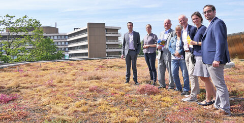 Eine Dachbegrünung gleicht viele dieser Einflüsse aus. Die Vorteile sind vielfältig, weiß Ulrike Tesch, Leiterin des Amtes für Umwelt und Klimaschutz, zu berichten: „Regenwasser wird zurückgehalten und Staub sowie Schadstoffe aus der Luft gefiltert. Zudem bietet ein begrüntes Dach einen neuen Lebensraum für Bienen und andere Insekten, wo einst Bodenfläche versiegelt wurde.“