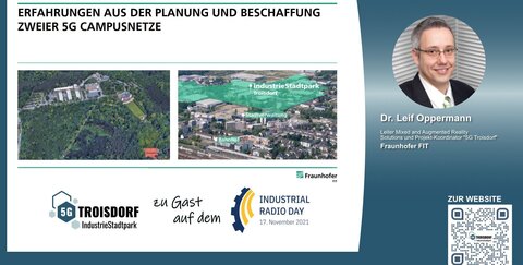 Am 17.11.2021 stellte Dr. Leif Oppermann, Leiter Mixed and Augmented Reality Solutions am Fraunhofer FIT und Projekt-Koordinator "5G Troisdorf", das 5G-Förderprojekt auf dem Industrial Radio Day vor. Der Vortrag bietet einen Überblick über 50 Jahre anwendungsorientierter Forschung im Rhein-Sieg-Kreis, zu den Zukunftsaussichten von 5G Campus-Netzen, sowie den Anforderungen und Herausforderungen bei der Nutzung für industrielle Anwendungen.