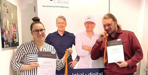 Corinna und Daniel aus dem Megra-Team haben erfolgreich den ersten Lexoffice Ausbildungslehrgang 2022/2023 absolviert, aufgebaut aus Selbststudium + Webinaren + Abschlussveranstaltung.