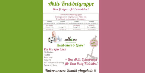 mom&me biete euch jetzt weitere Termine für die Aktiv-Krabbelgruppen an. Außerdem könnt ihr von einem Kombinangebot profitieren: Ein Kurs für dich & eine Aktiv Spielgruppe für dein Baby/Kleinkind.