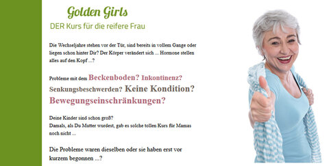 "Golden Girls" ist der Kurs für reifere Damen, die gerne beweglicher und fitter werden oder bleiben möchten und den Austausch in kleinen Gruppen schätzen.